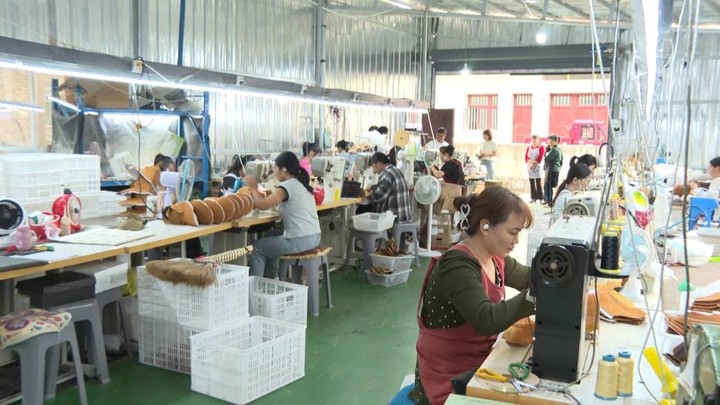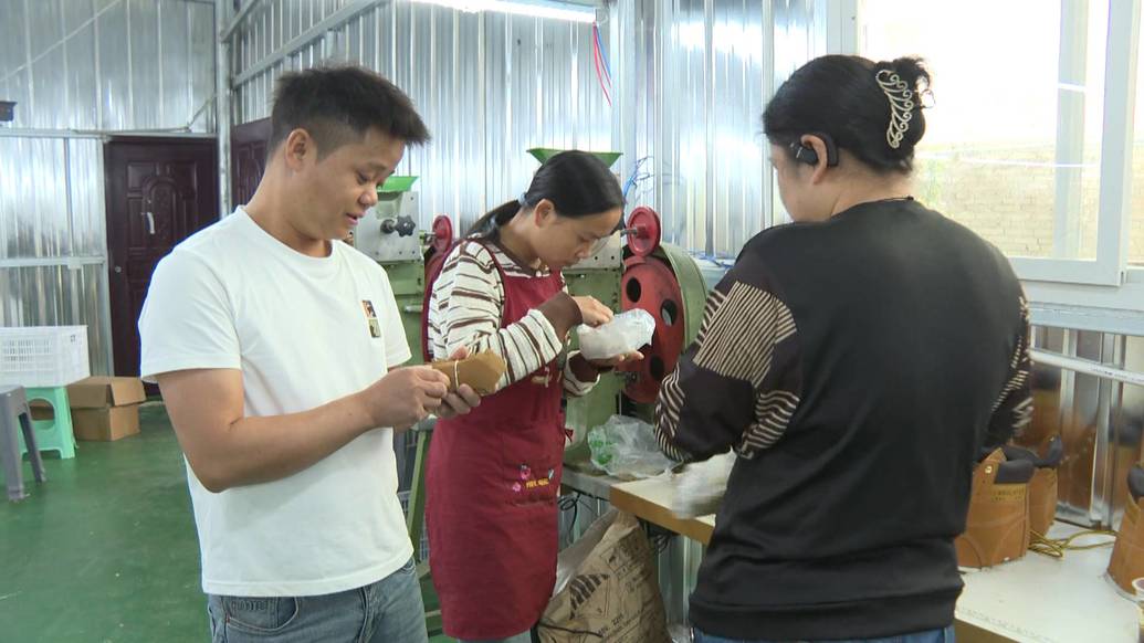 普定县杨江洪鞋业加工厂负责人 杨江洪:现在工厂订单基本上(每月)在1万多双左右,效益基本上和我自己在外面上班(差不多)一万多的工资,但是我在家里面,因为(工厂)在我自己院坝里面,出门就可以上班,虽然我现在跟外面收益差不多,(但)我现在自己也带动周边30多个居民收入,我也很开心的。