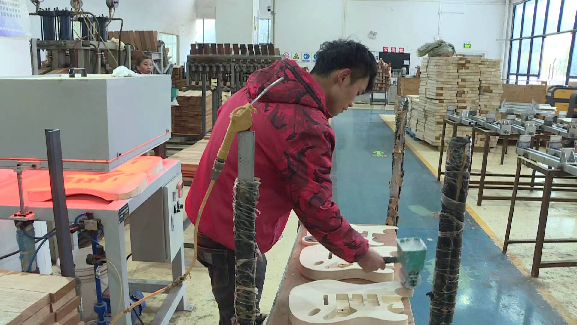 位于普定工业园区的贵州萨伽乐器有限公司生产车间内也是一派热火朝天的繁忙景象。机器设备高速运转,轰鸣声此起彼伏,工人们有条不紊地在各条生产线穿梭作业。经过一道道精细工序,一把把浸润着匠人匠心的吉他即将跨越山海,奔赴全球各地,交付到翘首以盼的客户手中。