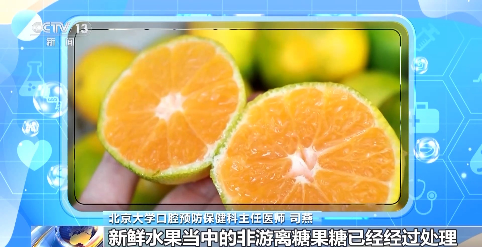 北京大学口腔预防保健科主任医师 司燕:大家觉得看似健康的一些果汁,其实不然。这就是已经把我们所谓的新鲜水果当中的非游离糖果糖就已经经过处理,比如破壁或者是榨汁的过程,其实就已经变成游离糖了。对于我们口腔其实是有一定的危害的。