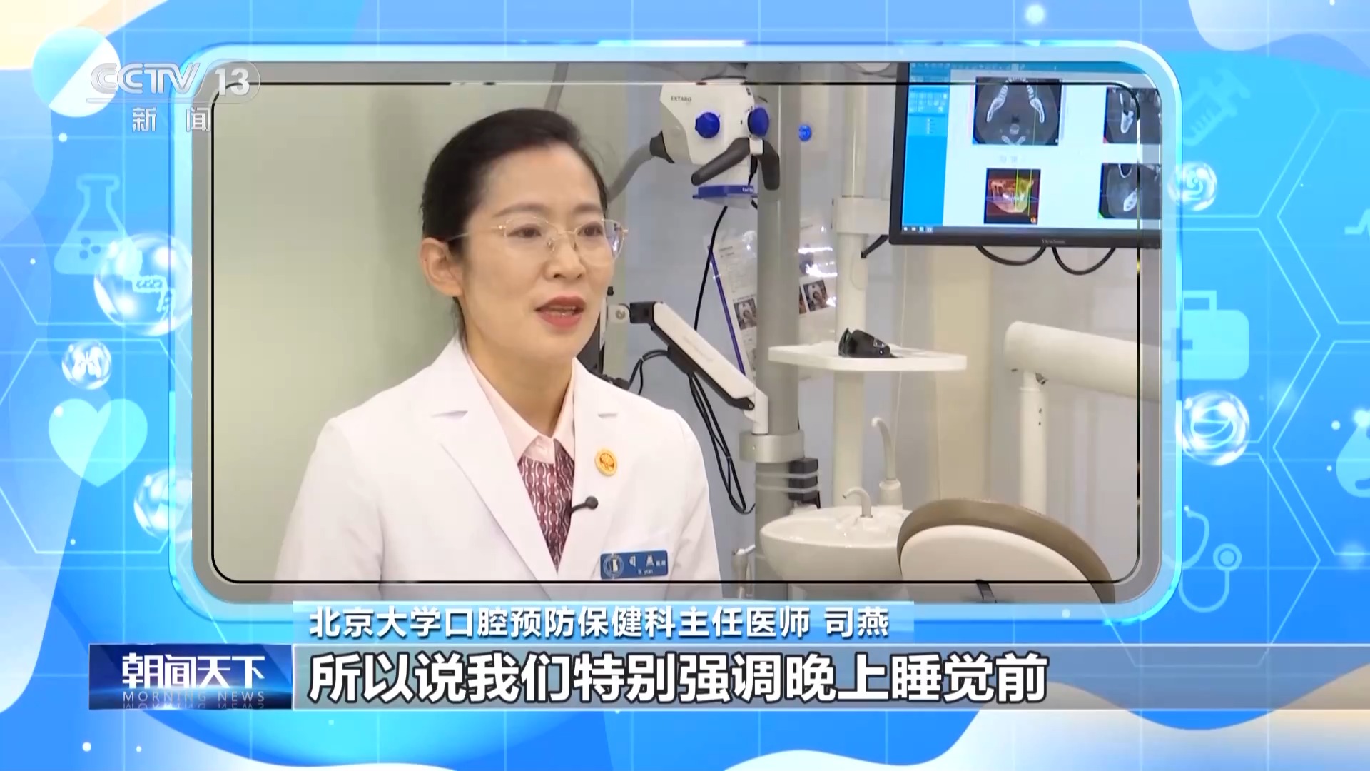 北京大学口腔预防保健科主任医师 司燕:如果我们要入睡了,我们的口腔是处于一个相对静止的状态,口腔唾液分泌也会减少,这个时候如果牙面上还有一些细菌脏东西的存在,它们会在安静的环境下大量繁殖,快速繁殖,去破坏我们的牙齿,所以说我们特别强调,晚上睡觉前一定要做好彻底的口腔清洁再去入睡。