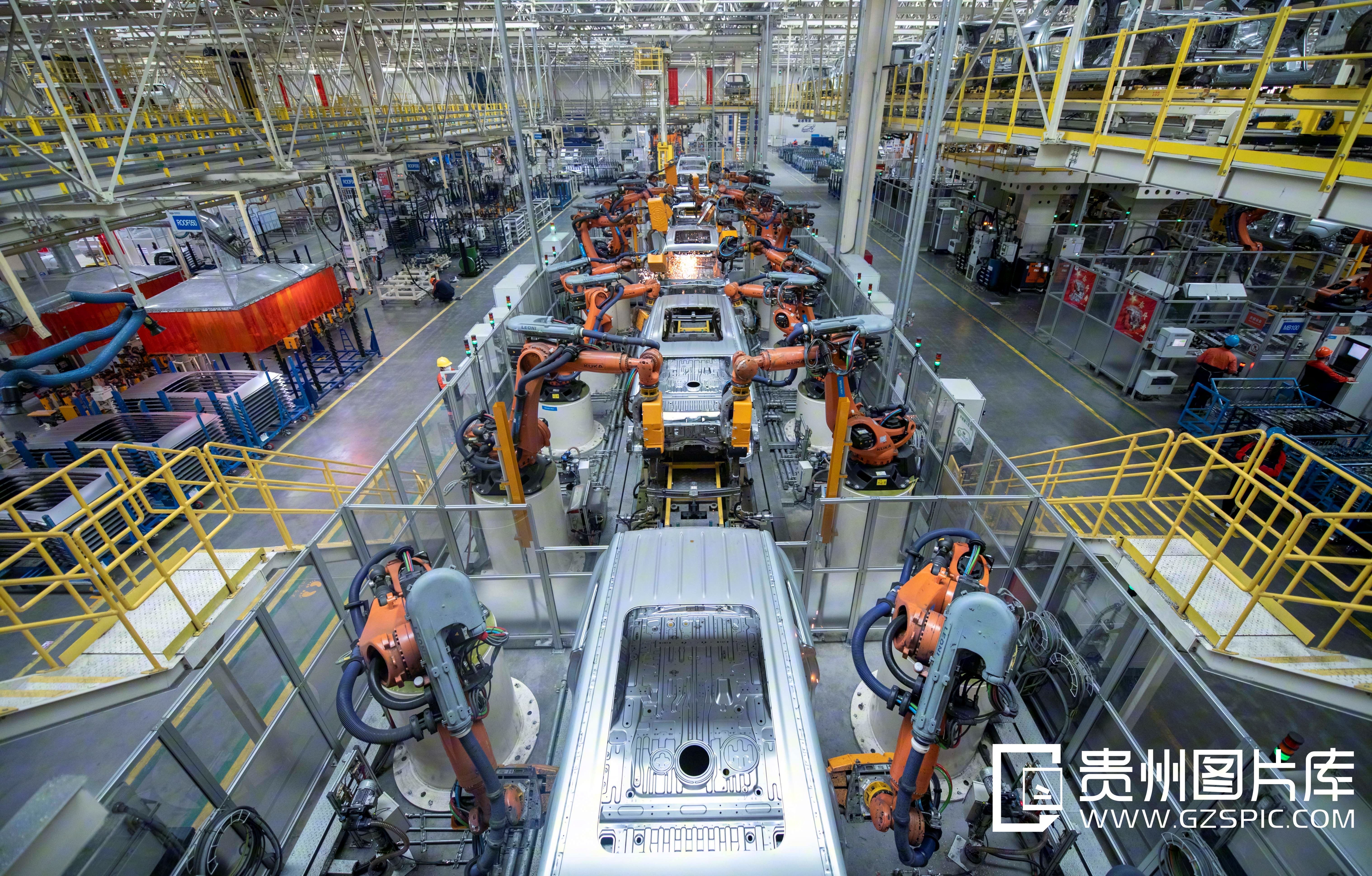 2021年4月14日,位于贵阳市观山湖区的吉利汽车贵阳制造基地内,全自动智能机器人正按拟定程序进行焊装作业。贵州日报天眼新闻记者 尚宇杰 摄