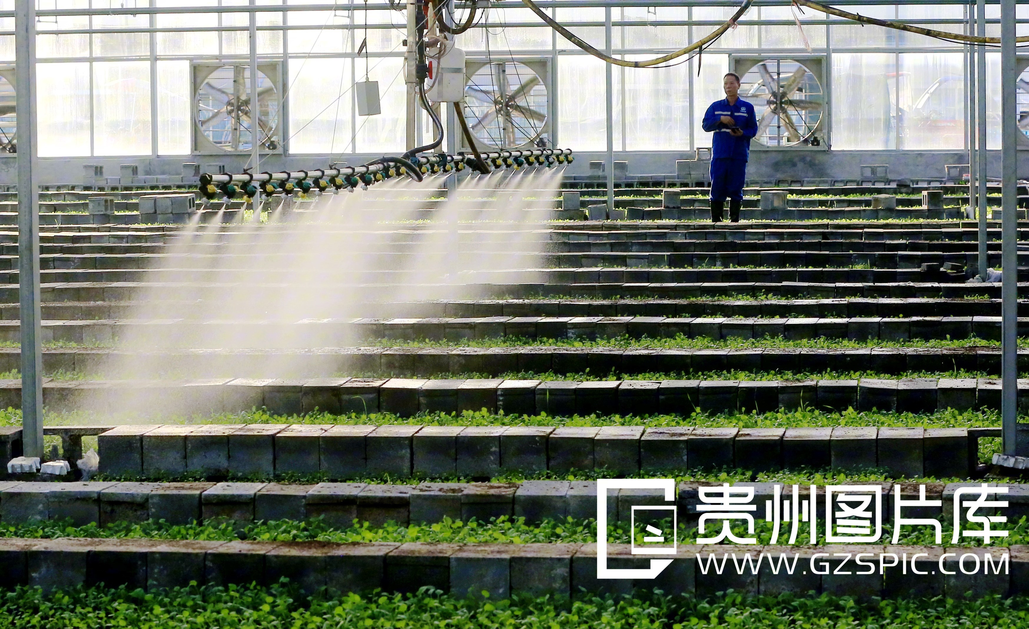2023年10月21日,在榕江县古州镇车江大坝智能育苗大棚内,农技人员在遥控喷淋系统为油菜苗浇水。杨文舒 摄