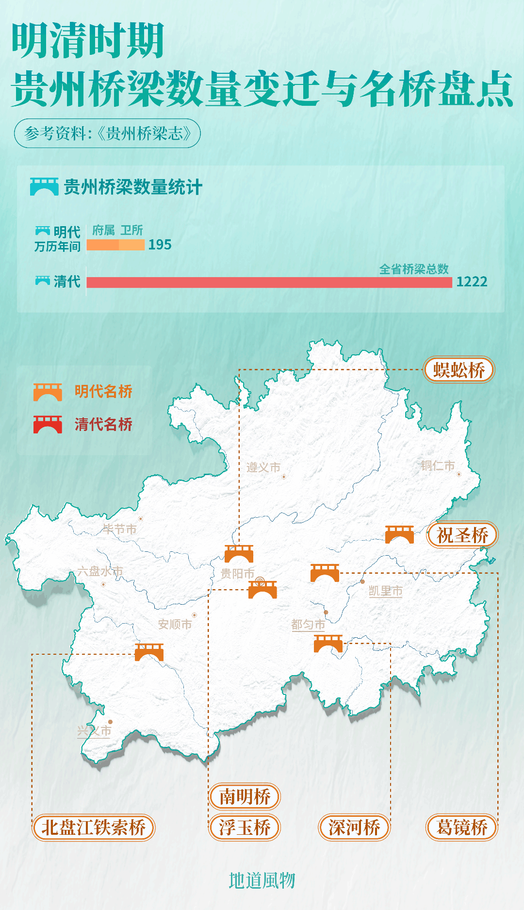 贵州山峦起伏,河网密布,桥的故事,同样是开拓交通、人文的历史。贵州人建桥的第一次高峰,正值明初贵州建省,与相邻省份打通驿道交通网的大潮。明万历年间,已有108座府属桥梁、87座卫所桥梁得以修建(《贵州通志》)。清代,贵州成为西南通衢,黔湘、黔滇、黔桂、黔川四大交通干线齐聚贵阳,据统计,1949年全省有1222座清代及之前的古桥尚存,正形成以拱桥、梁桥为主体,浮桥、索桥为辅助的桥梁系统,成为了贵州人“出山”的枢纽。