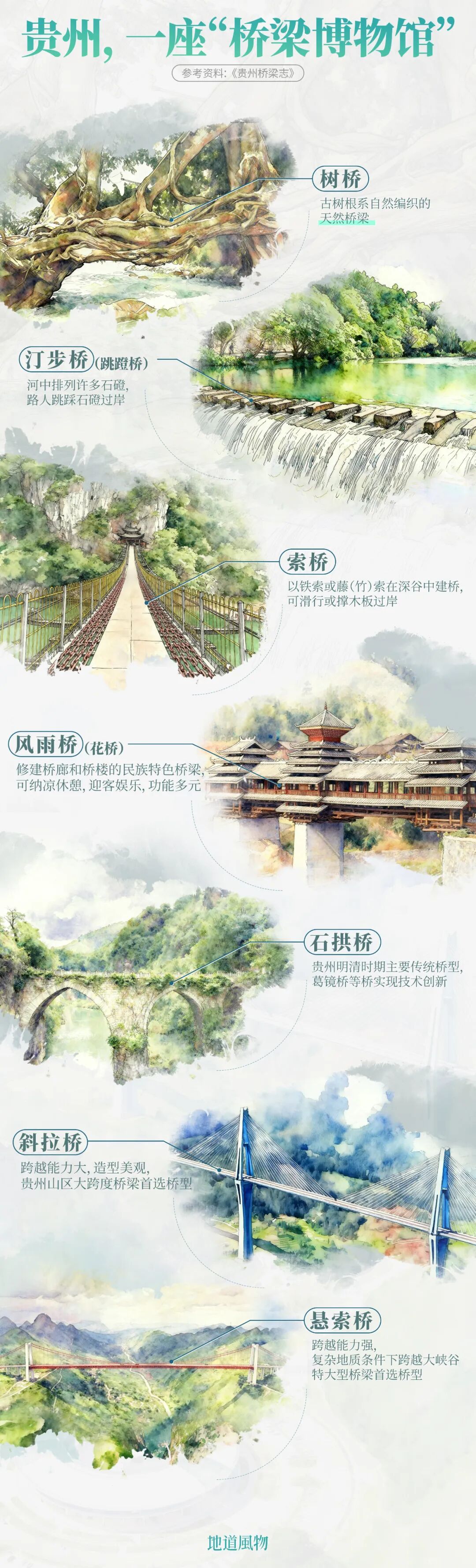从原始的树桥、汀步桥,到铁索桥、石拱桥,再到今天以先进技术铸就的一座座世界级斜拉桥、悬索桥,你几乎可以在贵州这座“桥梁博物馆”见到所有的桥梁形态。