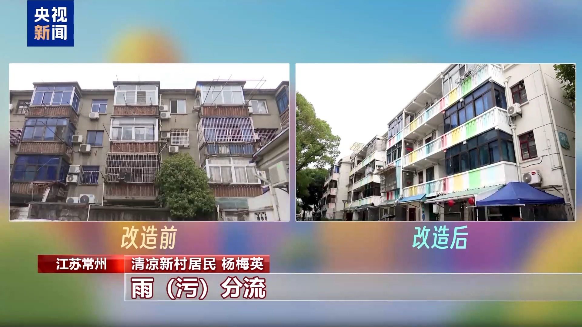 清凉新村居民 杨梅英:“十四五”期间的变化太大了,老小区改造,建造在1978年,1979年,80年代的房子。管道都烂掉了,一下雨,一楼家家有水。现在换了管道,雨污分流,外墙墙面重新粉刷,和新小区已经差不了多少了。