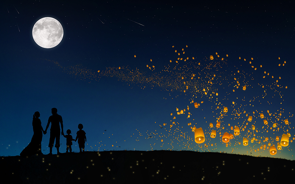 天上月圆,人间团圆。一轮圆月寄托着人们思念故乡、思念亲人之情,也寄托着期盼丰收和幸福之意,天上捧出一轮圆月,地上捧出无数花灯,天上月与地上灯交相辉映,良辰美景,丰悦可人。
