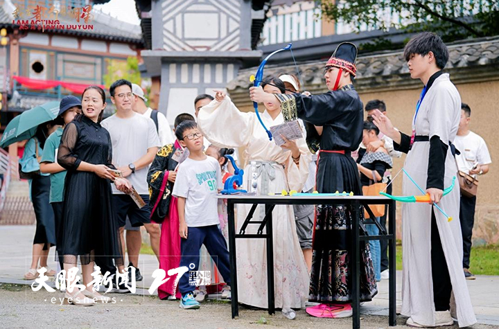秦汉影视城内,身着各式汉服的游客与古风建筑相映成趣,仿佛踏入千年之前的秦汉街巷。检票口处,身着古装的NPC化身江湖侠客,拉开“江湖相逢”迎宾序幕;百戏坊门口,“蜀国五虎”身披亮银盔甲,伴着音乐摆出帅气造型,与游客简单互动合影;园区内还不时有“奇货郎君”“财神献宝”等角色,邀请游客参与小游戏,现场充满欢声笑语。不仅如此,《荆轲刺秦》《虞兮梦圆》实景表演、“花神”高跷巡游等节目相继开演,秦汉历史文化场景被生动还原。