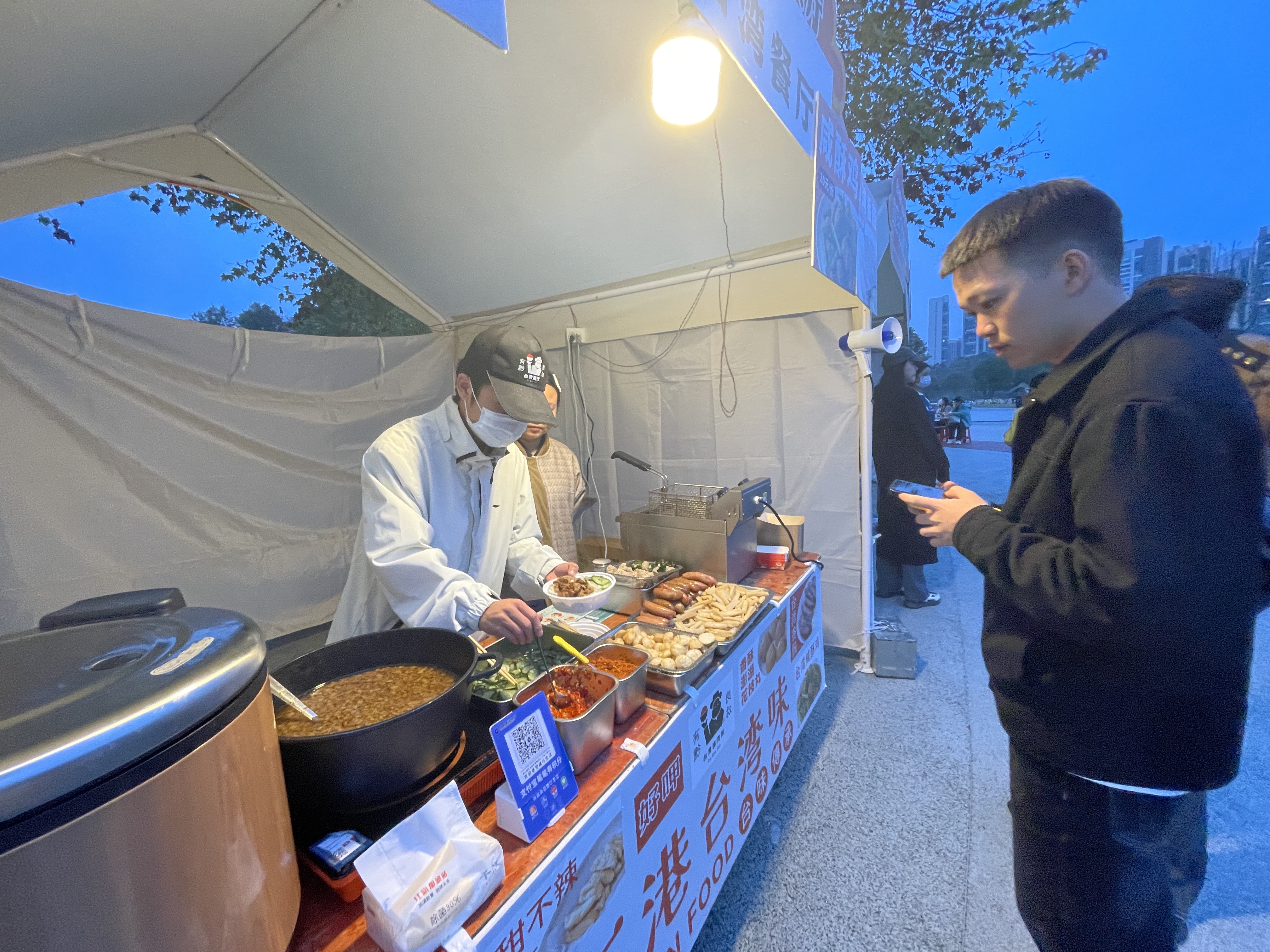 在“烟火品鉴区”,“良叔有黔”的摊位前食客络绎不绝。工作人员舒龙云正忙着向顾客介绍卤肉饭、甜不辣、台湾香肠等特色小吃。