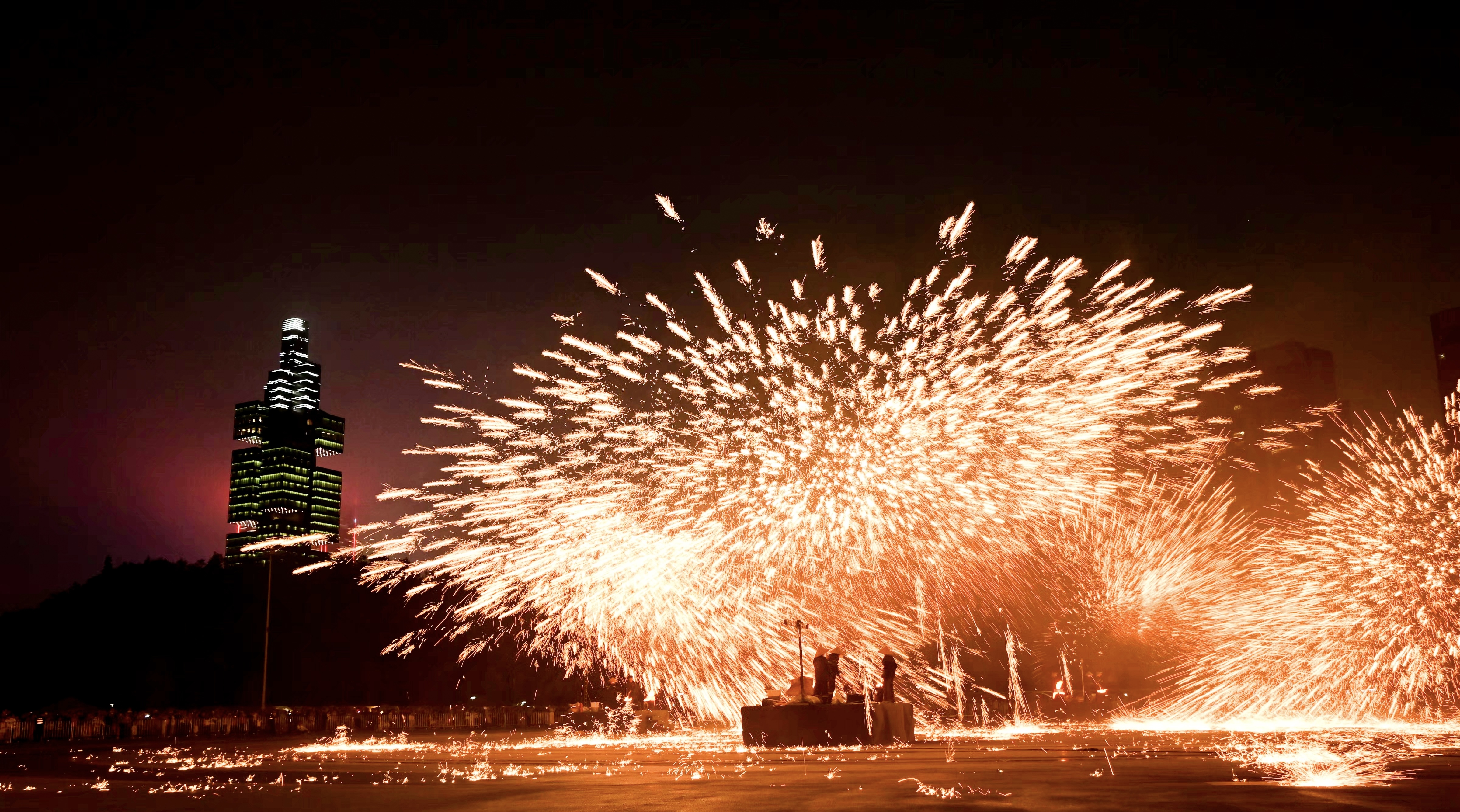 晚上八点半,整日狂欢的顶点如期而至。千年非遗“打铁花”率先登场,匠人们将高达1600℃的铁水奋力泼洒向空中,瞬间化作万点金星,犹如一场绚烂的“流星雨”,“金玉满堂”的古老祝福以其原始的粗犷和炽热,震撼了所有观众。
