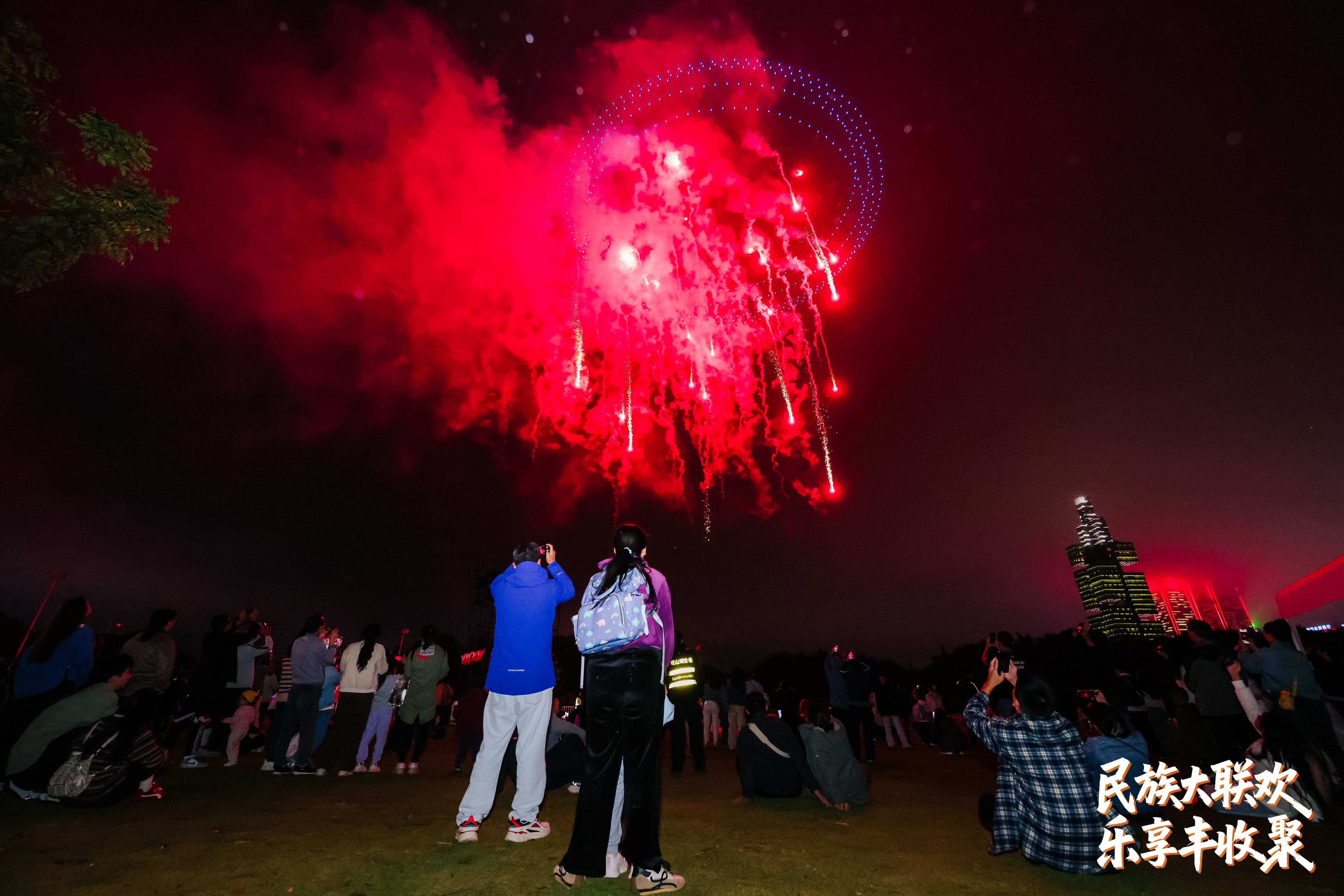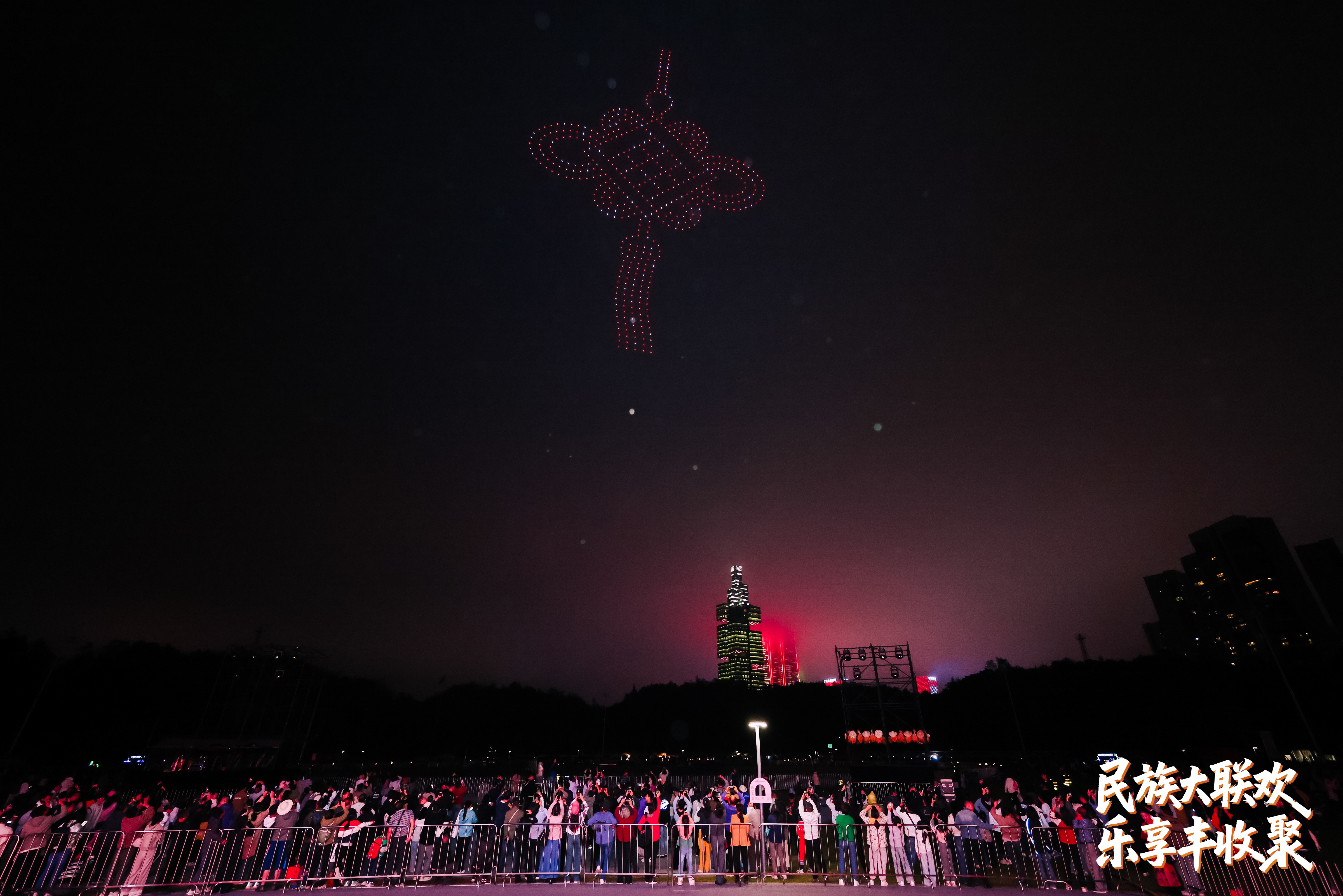 未等铁花的余温散尽,数百架无人机腾空而起,在夜幕中精准排列,变幻出“石榴”“中国结”等瑰丽图案,还有冷焰火随之绽放,科技感十足。一古一今,一火一光,在观山湖的夜空中完成了史诗级的同框与共鸣,共同诠释着“中华民族一家亲”的深厚情谊与时代活力。