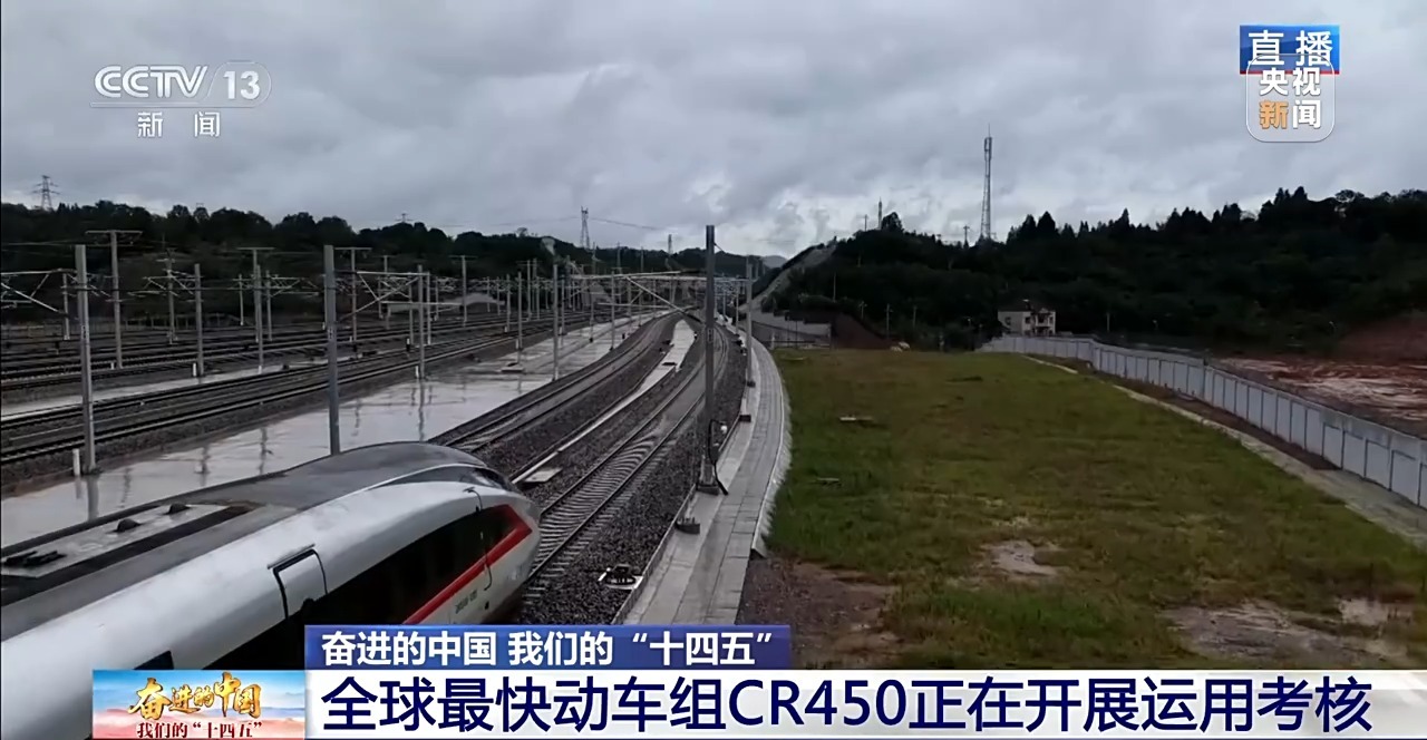 现在我们看到,CR450动车组,正在从宜昌北站发车,列车正在驶离站台,现在的速度看上去并不快,但是我要告诉大家一组数字:从起步到提速至时速350公里,它只需要4分40秒,而此前正在运行的时速350公里复兴号动车组则是需要6分20秒,这个提速的周期缩短了100秒。相信大家特别想知道,什么时候,在哪条线路能坐上这样的列车呢?对此中国铁道科学研究院的相关负责人在接受我们采访时表示,目前还没有具体的信息,但是她也透露,明年将会在成渝中线展开更接近运营条件的全面测试,我们也期待着在“十五五”开局之年,CR450能带给大家更多的好消息。