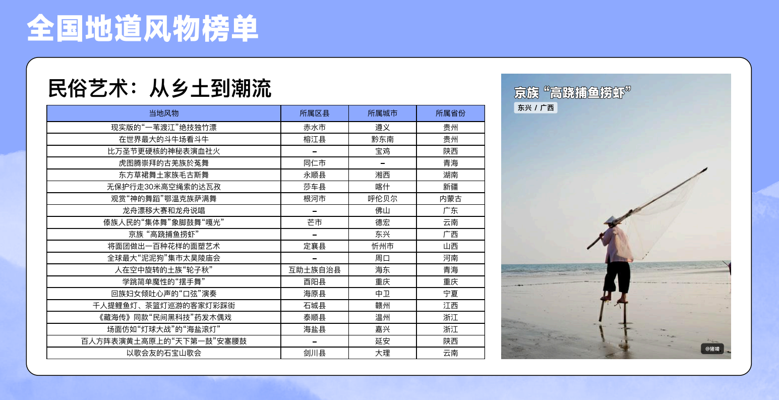《中国风物报告》系统梳理了全国一百个独特风物,涵盖节庆习俗、非遗传承、特色美食、民俗艺术和文化IP五大类别。不同榜单中,贵州多地风物上榜。