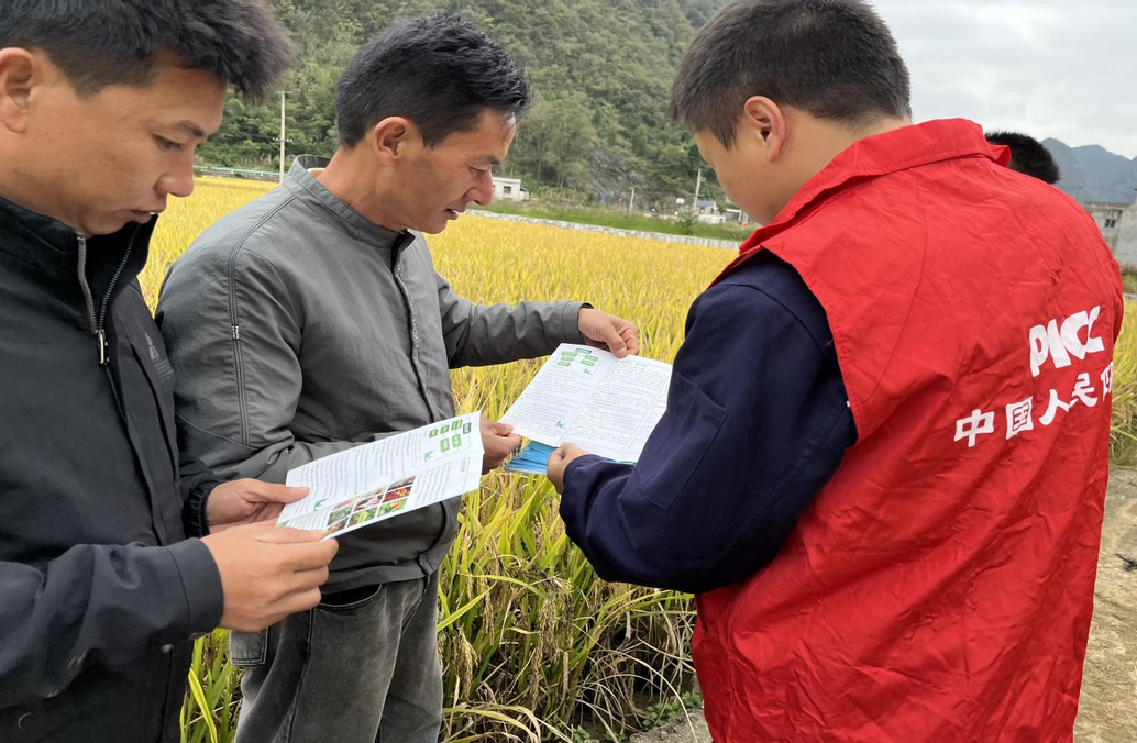 在紫云县的稻田旁,身着统一制服的人保财险工作人员穿行于田埂之间,与正在忙碌的农户展开面对面交流。他们不再是简单的政策宣讲员,而是化身为农户的“风险分析师”和“服务指导员”。工作人员结合今年当地水稻生产过程中遭遇的洪涝、病虫害等真实案例,与农户一同复盘分析致灾原因,探讨科学防控措施,让农户深刻认识到农业保险在转移自然风险、稳定种植收入方面不可替代的“稳定器”作用。
