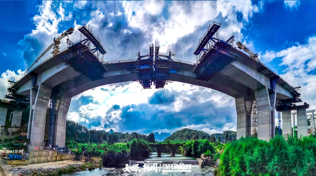 图为2024年7月7日,正在施工中的贵平高速公路控制性工程之一摆龙河大桥。贵阳至北海高速公路贵阳至平塘项目沿途穿越多个生态保护区域。由于大桥所在的摆龙河国家湿地公园为生态敏感区,施工单位以技术创新实现了桥面与三级沉淀池之间的水循环和零排放。