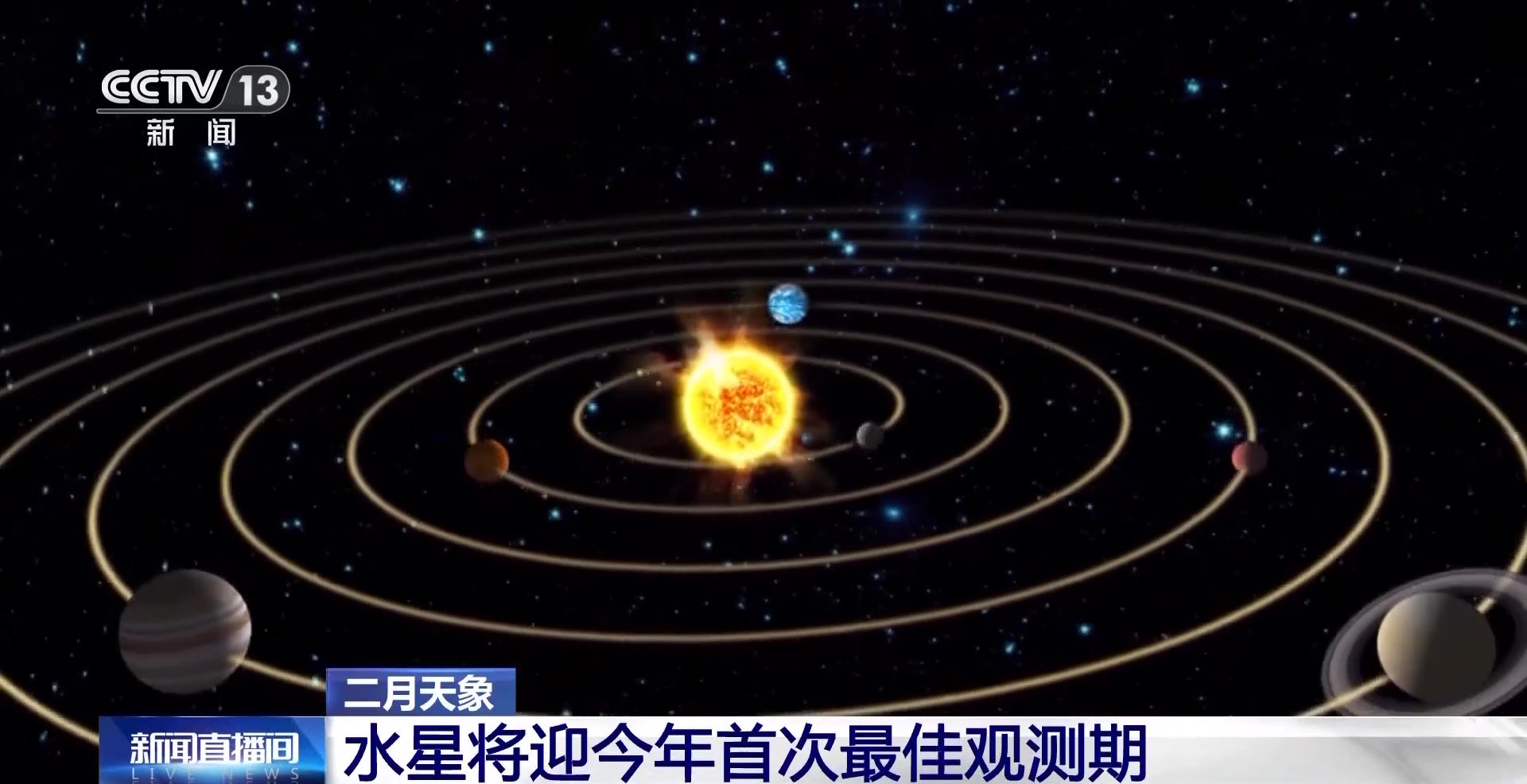 北京天文馆高级工程师 寇文:水星在太阳两边来回摆动,最大不会超过一个角度。当水星在太阳的东边,角度达到最大的时候,这时候就叫东大距。东大距实际上是傍晚的时候,我们朝西方天空看,太阳落山以后,水星顶多看半个小时可能就落下去了。