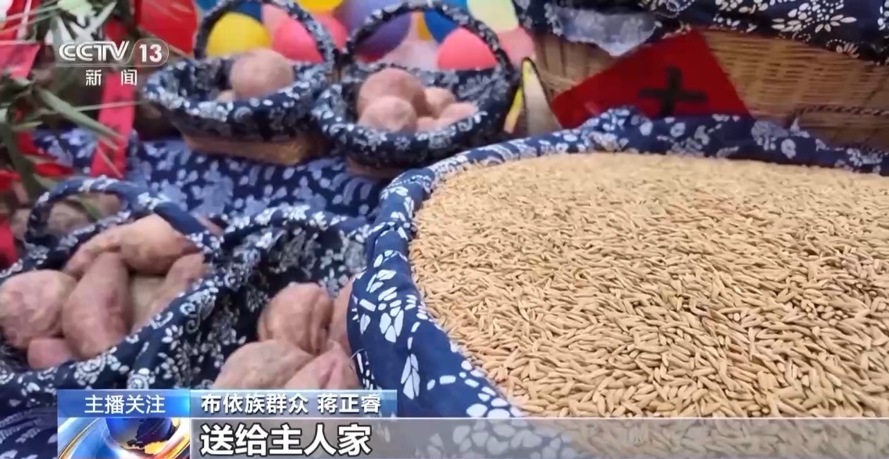 布依族群众 蒋正睿:带上自家今年收成比较好的东西作为礼物,送给主人家,我今天带的是我们的大米,寓意着来年有一个好的丰收,日子越过越红火。