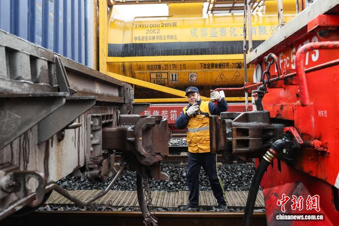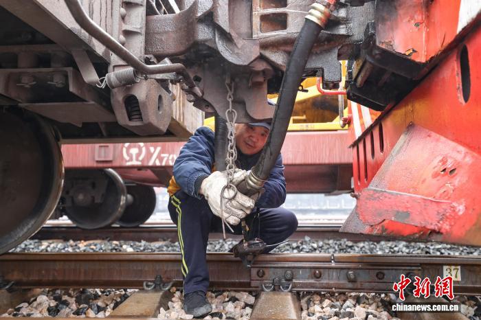 2月9日,调车组工作人员在连接车辆风管。中新社记者 瞿宏伦 摄