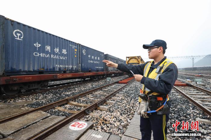 2月9日,调车组工作人员在联系司机进行连挂作业。中新社记者 瞿宏伦 摄
