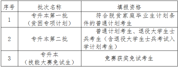 2.脱贫家庭毕业生计划考生可同时填报第一批次和第二批次的志愿,但两个批次志愿所填报的院校必须是同一所院校,且所填报的专业相同或专业考试科目相同的两个专业(以招生本科院校公布的招生章程为准)。若考生两个批次志愿所填报的学校不是同一所学校,或虽为同一所学校但所填报的两个专业的专业考试科目不同,则所填报的第一批次志愿无效,考生只能参加第二批次志愿的专业课考试。