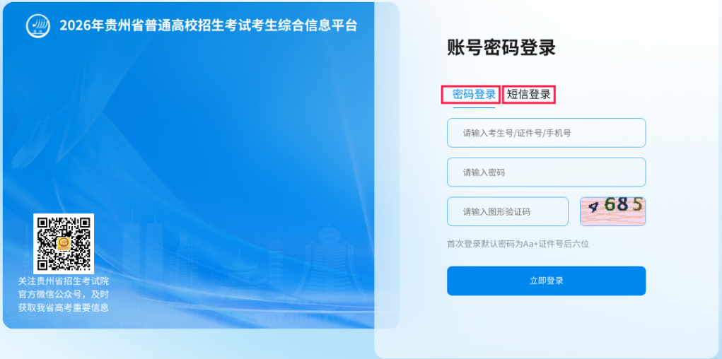 输入考生号/证件号,在登录页面中选择“密码登录”或“短信登录”。