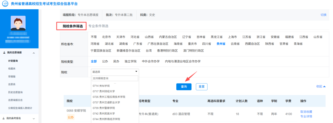通过【院校条件筛选】和【专业条件筛选】筛选院校专业信息。不同考试类型的考生只能查询到对应招考类型下的招生计划。