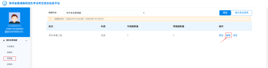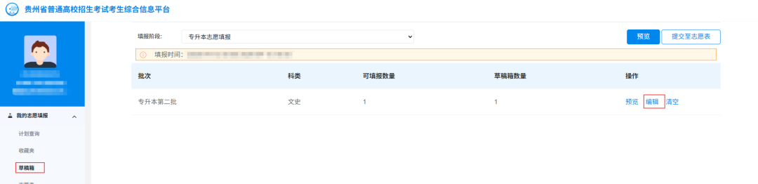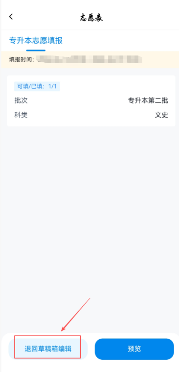 已提交志愿退回至草稿箱后,可在【草稿箱】中对志愿再次进行编辑,编辑结束后须再次进行提交。考生在志愿填报期间,最多可提交3次志愿,在填报时间截止后,所填报志愿不能进行任何修改。