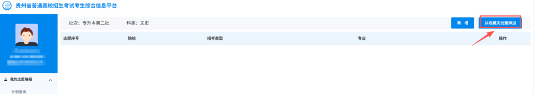 方式1:通过【服务】→【我的志愿填报】→【草稿箱】进入草稿箱页面,在页面上点击【可填/草稿箱】,选择【从收藏夹添加】。