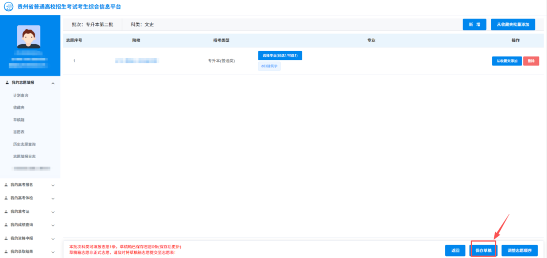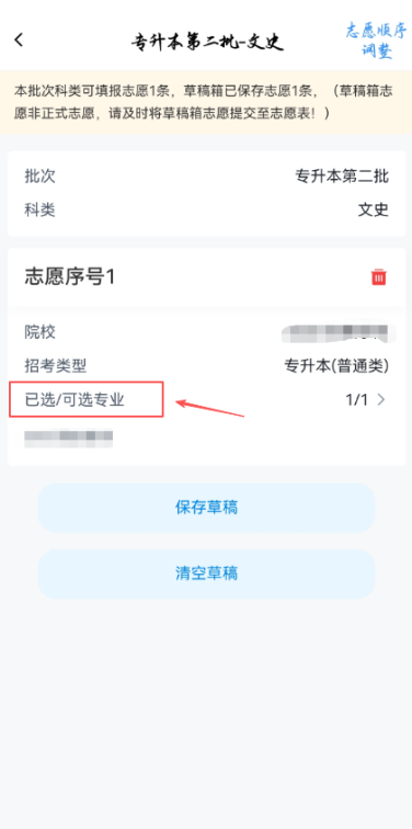 专升本志愿填报只能填报1个院校志愿,该院校志愿下最多可选择1个专业。在填报时须先在草稿箱中填报志愿草稿,志愿草稿核对无误后,须提交至志愿表完成志愿填报。具体步骤如下: