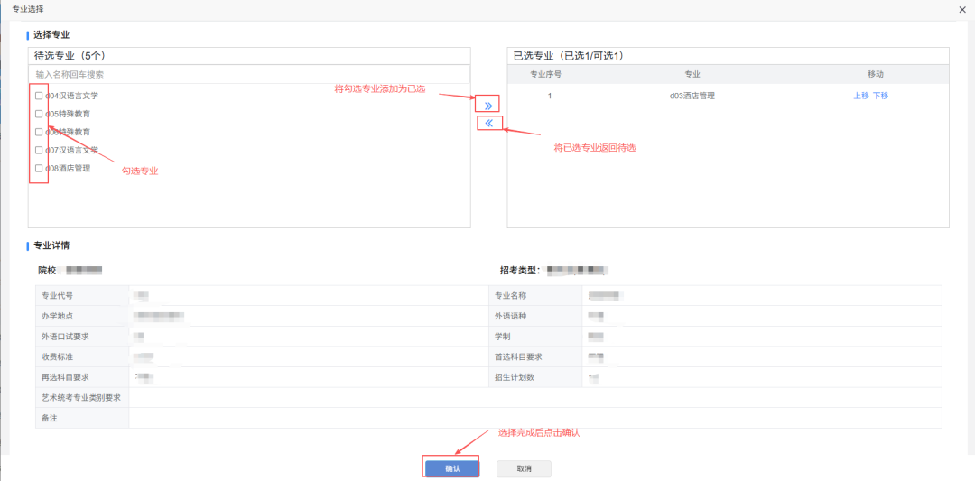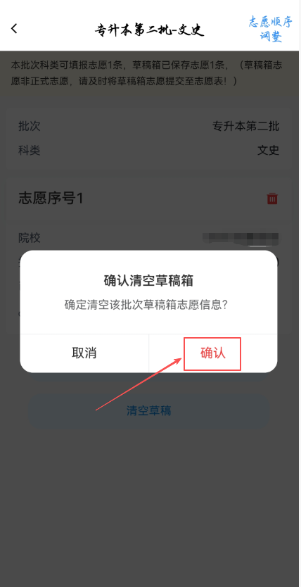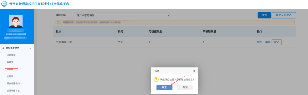 通过【草稿箱】→【编辑】功能,编辑志愿草稿,进行专业调整和确认,点击【确认】→【保存草稿】完成志愿草稿的编辑。