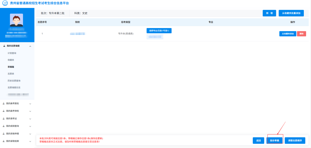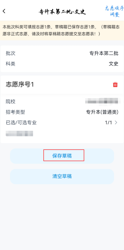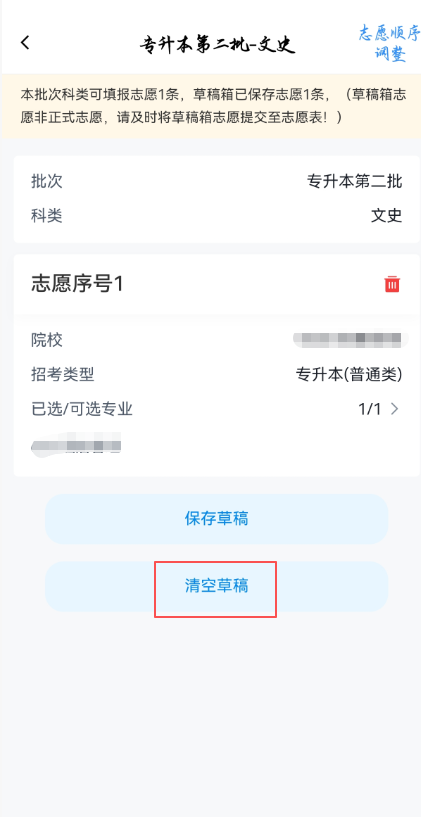 如草稿箱已存在1个院校志愿,则不能添加其他院校志愿。如需添加其他院校志愿,须先清空原有院校志愿。