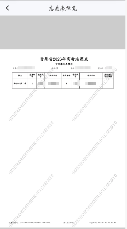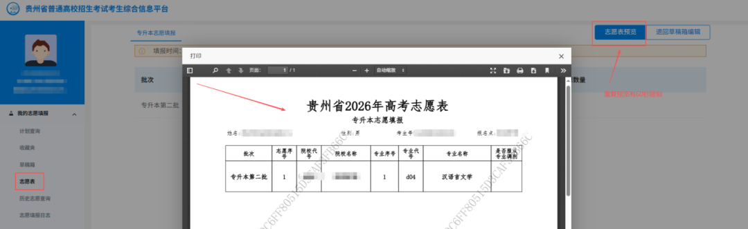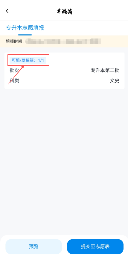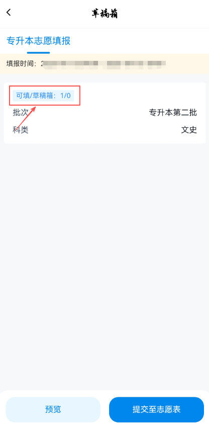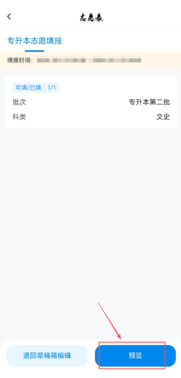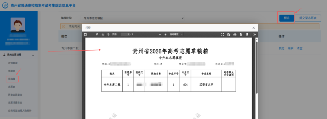 在草稿箱中添加志愿后,考生可通过【草稿箱】→【预览】功能,查看自己的“考生志愿草稿表”。