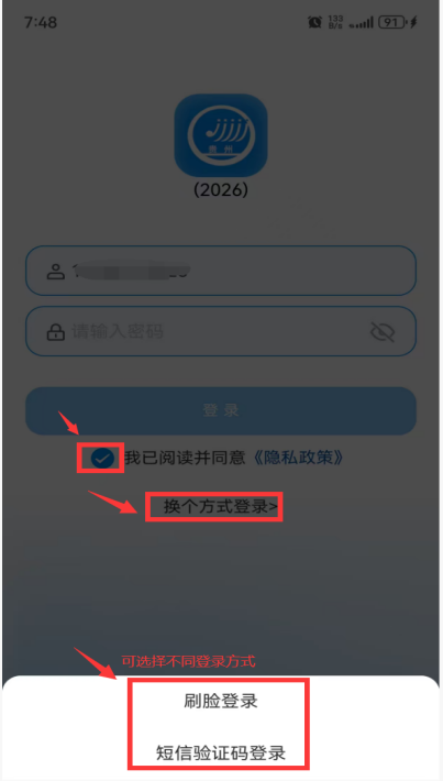 考生在手机上打开【贵州招考】APP,输入本人考生号或证件号或手机号,选择【我已阅读并同意《隐私政策》】,系统默认登录方式为【密码登录】,考生可点击下方【换个方式登录】,选择【短信验证码登录】或【刷脸登录】。