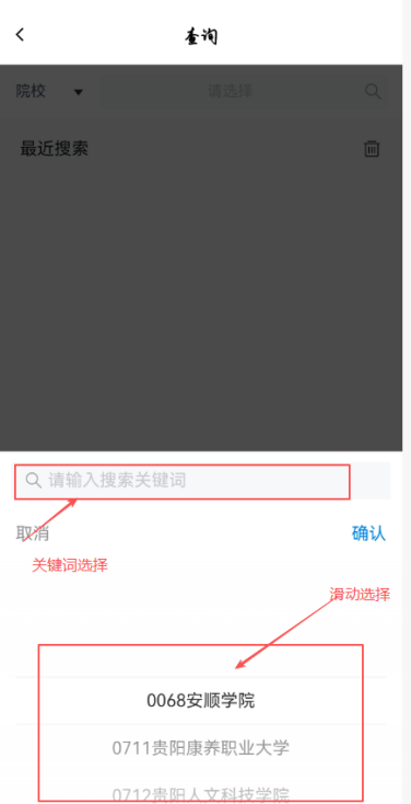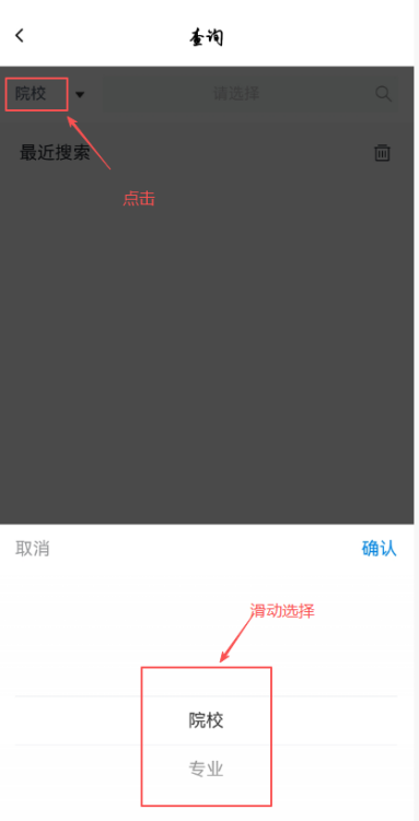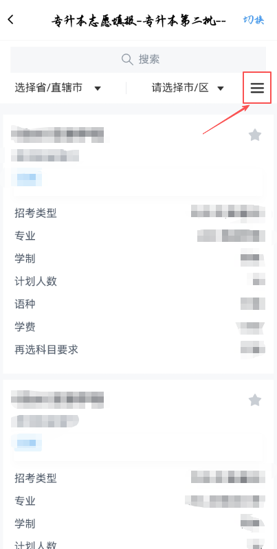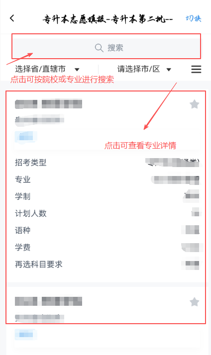 考生进入计划查询界面后,点击页面上方【搜索】框,进入院校/专业筛选查询页面。