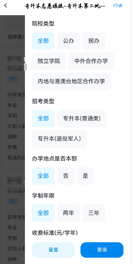 注:【院校条件筛选】和【专业条件筛选】为联动查询,筛选院校后再筛选专业,查询结果为筛选院校的对应专业。可点击【重置】按钮清空已选条件。
