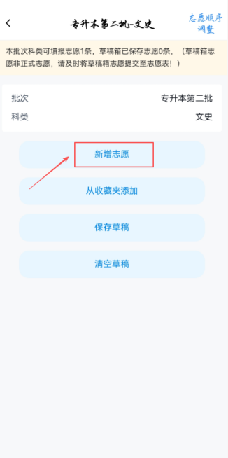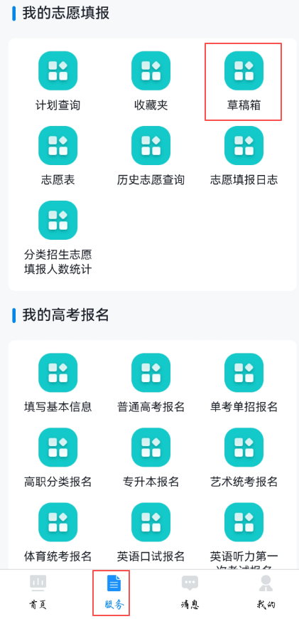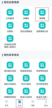 方式2:通过【服务】→【我的志愿填报】→【草稿箱】进入草稿箱页面,在页面上点击【可填/草稿箱】,选择【新增志愿】。