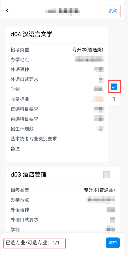 在院校栏选择院校后点击【确定】按钮,进入专业选择,在屏幕下方会提示已选和可选专业的数量,选择好后点击上方的【完成】按钮,提示新增成功,点击【保存草稿】完成志愿草稿的添加。