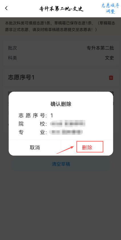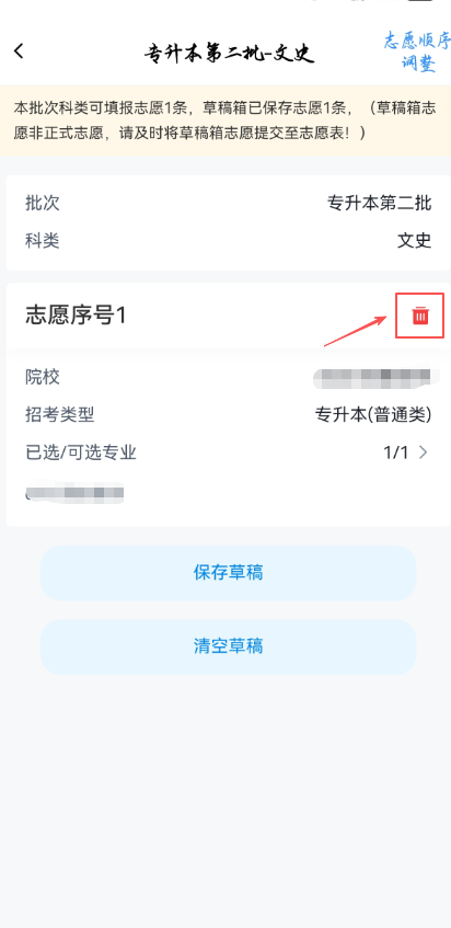 如草稿箱中已存在1个院校志愿,则不能添加其他院校志愿。如需添加其他院校志愿,可选择【草稿箱】,点击【可填/草稿箱】,点击【清空草稿】选择【确认】或点击【志愿序号1】右侧按钮选择【删除】可删除草稿志愿。