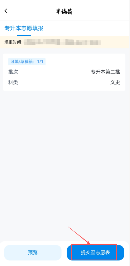 考生提交志愿草稿成功后,须点击【志愿表】→【志愿表预览】,查看和确认所填报的院校专业志愿是否提交成功。