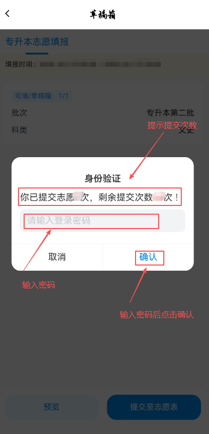考生确认所填写志愿草稿准确无误后,须点击【草稿箱】→【提交至志愿表】,输入登录密码进行确认、确保提交成功后,志愿方可生效。