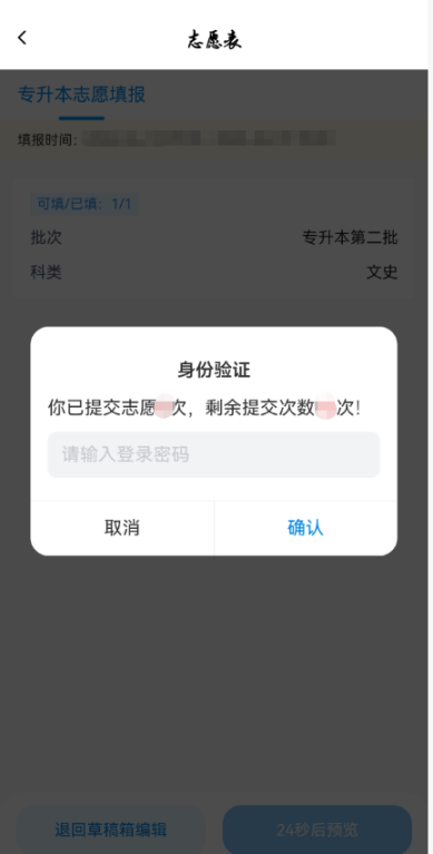 考生如需修改已提交志愿,可通过【志愿表】→【退回草稿箱编辑】,将已提交志愿退回至草稿箱,此时系统会提示已提交志愿表次数和剩余可提交次数,输入登录密码后确认退回。