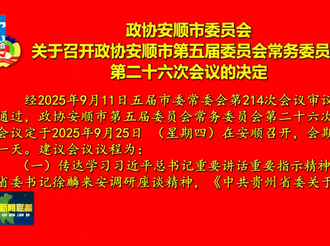 政协安顺市委员会关于召开政协安顺市第五届委员会常务委员会第二十六次会议的决定2025年09月18日